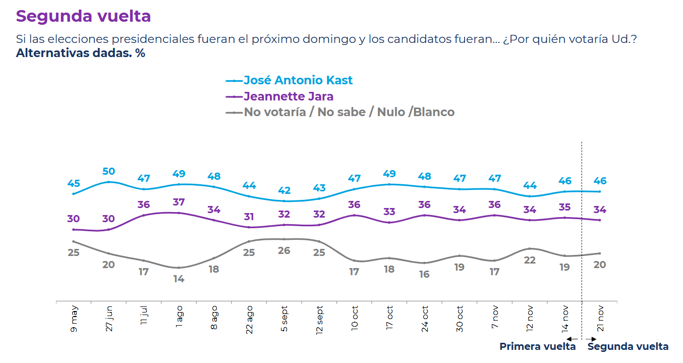 However, if the reason people broke Boric was become Kast was considered more extreme in the political environment of that time, that doesn’t hold any more, because the anti-extreme vote would also be anti-Jara vote. I think we might see a fair amount of don’t knows going for a null vote this time.