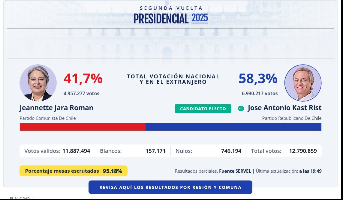 I am on Chile Vision and they are comparing first round vs second round results across specific tables. And comparing results for a set number of locations that they think might predict the result. It’s not looking good for Jara so far, it looks like the polling might have been in the right ballpark.
