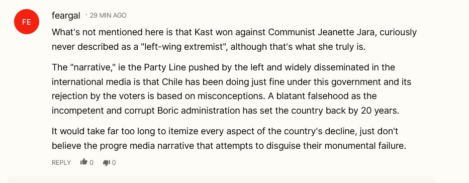 Why would the electors vote for this allegedly “Trump-inspired” extremist instead of Commie Jara, who was part of the pathetic Boric government, and promises more of the same? They must be all mad - according to the Guardian.