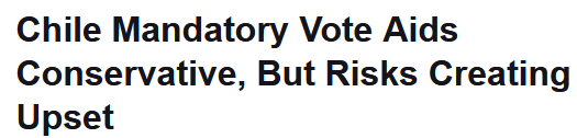 Bloomberg usually spouts rubbish on what they say about Chile, but they may be onto something here, despite the dubious notions. (The story seems to assert that mandatory voting would be done for the first time in the coming presidential election, while I seem to recall that the presidential election of 2009 was also mandatory and there was a belief that this somehow favored Piñera. For the coming presidential election, a number of residents of legal age would not be obligated, despite that article’s assertion).