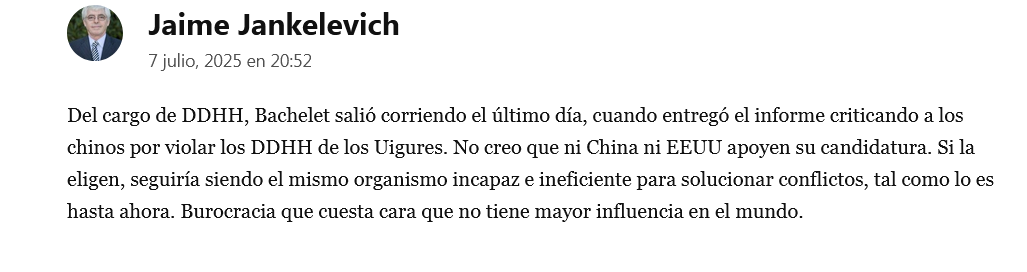 Mosciatti recently commented that recent Chilean political figures seem to feel that the country is too small a stage for their talents. Even before Piñera’s disastrous foray onto the world stage, we had Bachelet’s widely-criticized performance as UN HR Commissioner. Despite that failure, it looks as if she will be lobbying for the UN Secretary-General position, which is up for grabs quite soon.